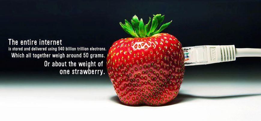 Using some very rough maths, it’s been estimated that the internet weighs about the same as a large strawberry (about 50 grammes): http://soc.li/Gnqs1lG